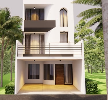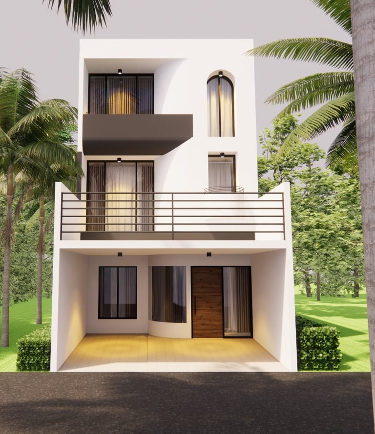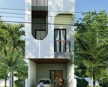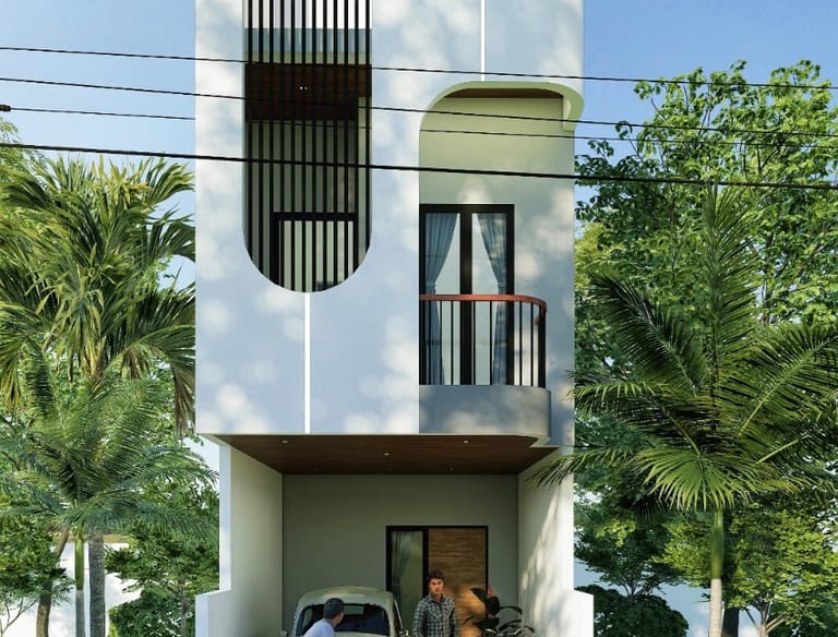 Rumah 3 lantai ini memiliki fasad bagian depan yang elegan dengan perpaduan warna yang menenangkan.