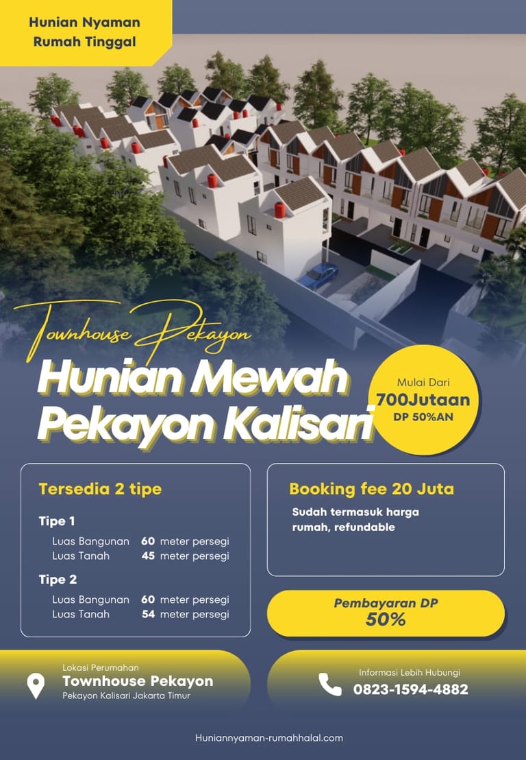 Hunian Nyaman Townhouse. Hunian nyaman townhouse pekayon merupakan perumahan modern yang terletak di kawasan Pekayon Kalisari Ps.Rebo Jakarta Timur. Dengan lokasi yang strategis dan akses yang mudah, townhouse ini menawarkan lingkungan tinggal yang tenang dan nyaman.